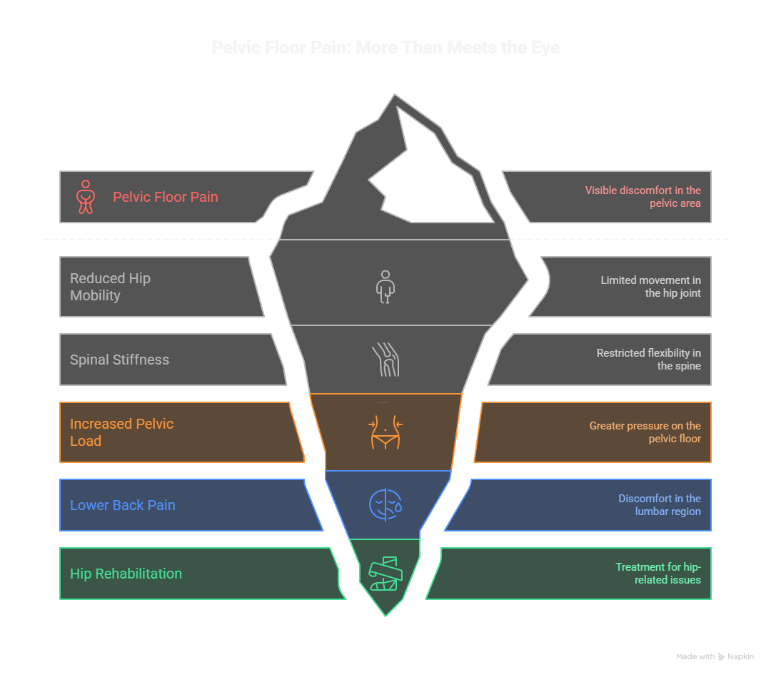 For example, reduced hip mobility or spinal stiffness can increase load on the pelvic floor during sitting, walking, or lifting. This is why many patients with pelvic pain also report symptoms commonly treated through